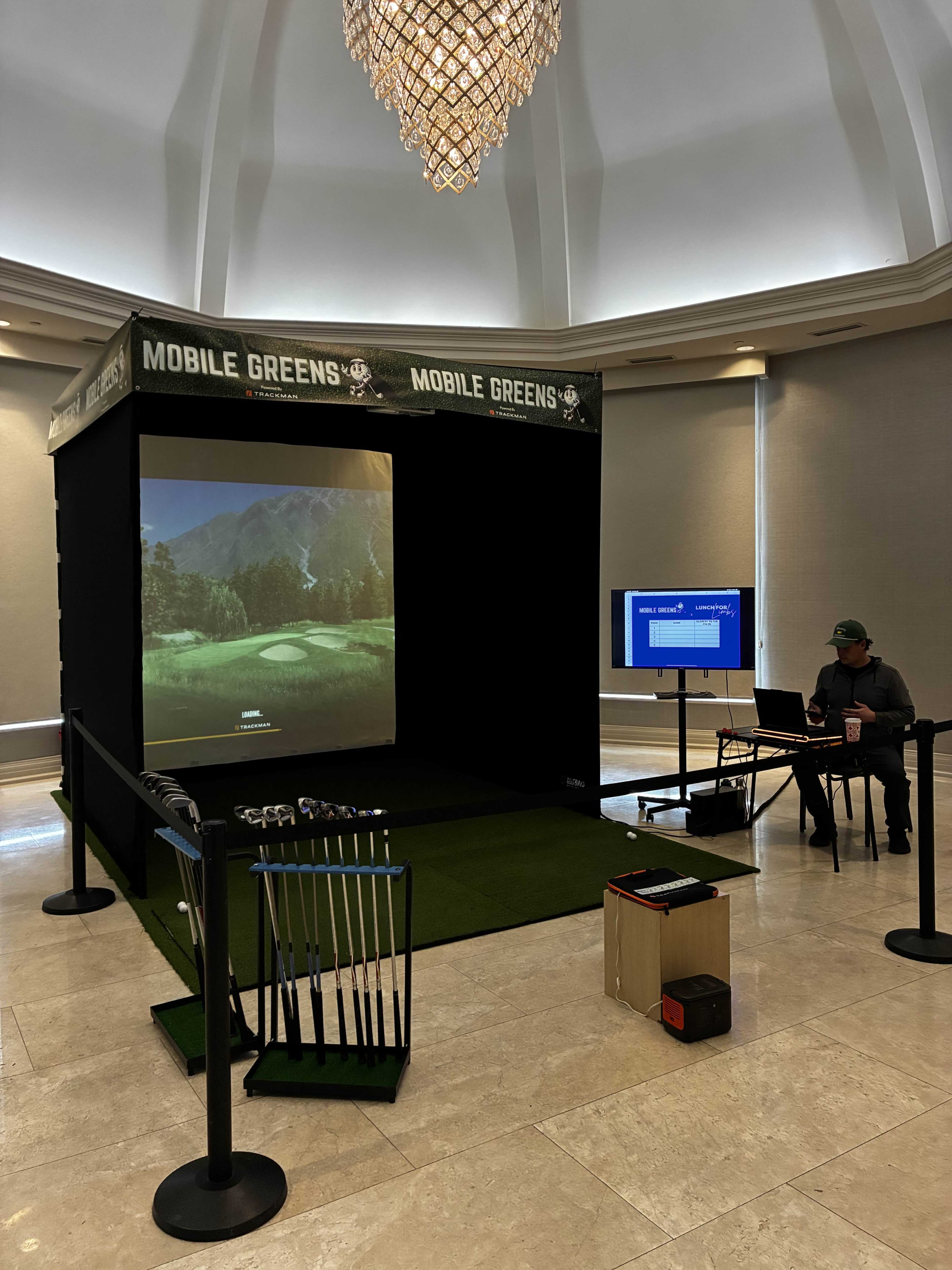 Includes 4 sets of golf clubs, 2 on-site hosts, live leaderboard, and TrackMan technology.